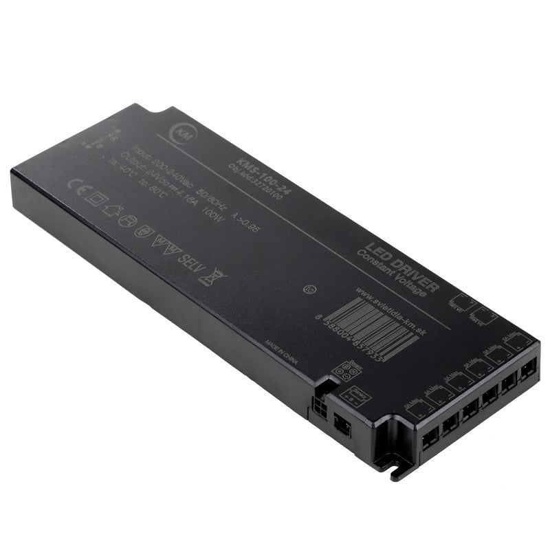 Napájecí zdroj SMART LED KMS-100-24, s výkonem 100W a konstantním výstupním napětím 24V DC 4,16A, krytí IP20 s osmi konektory na výstupu (max. 3A/výstup, na jeden výstup max. 72A, celkově max. 100W), konektorem pro společné centrální ovládání všech výstupů pomocí externích vypínačů a senzorů a konektorem pro propojení více napájecích zdrojů za účelem synchronizace ovládání. Napájecí zdroj je v tenkém provedení s rozměry 201x71x18mm vhodný pro instalaci do úzkých prostor. Součástí je napájecí kabel s délkou 1,2m.